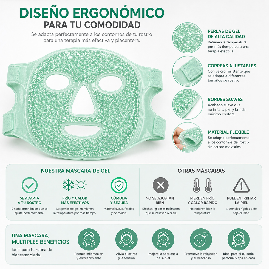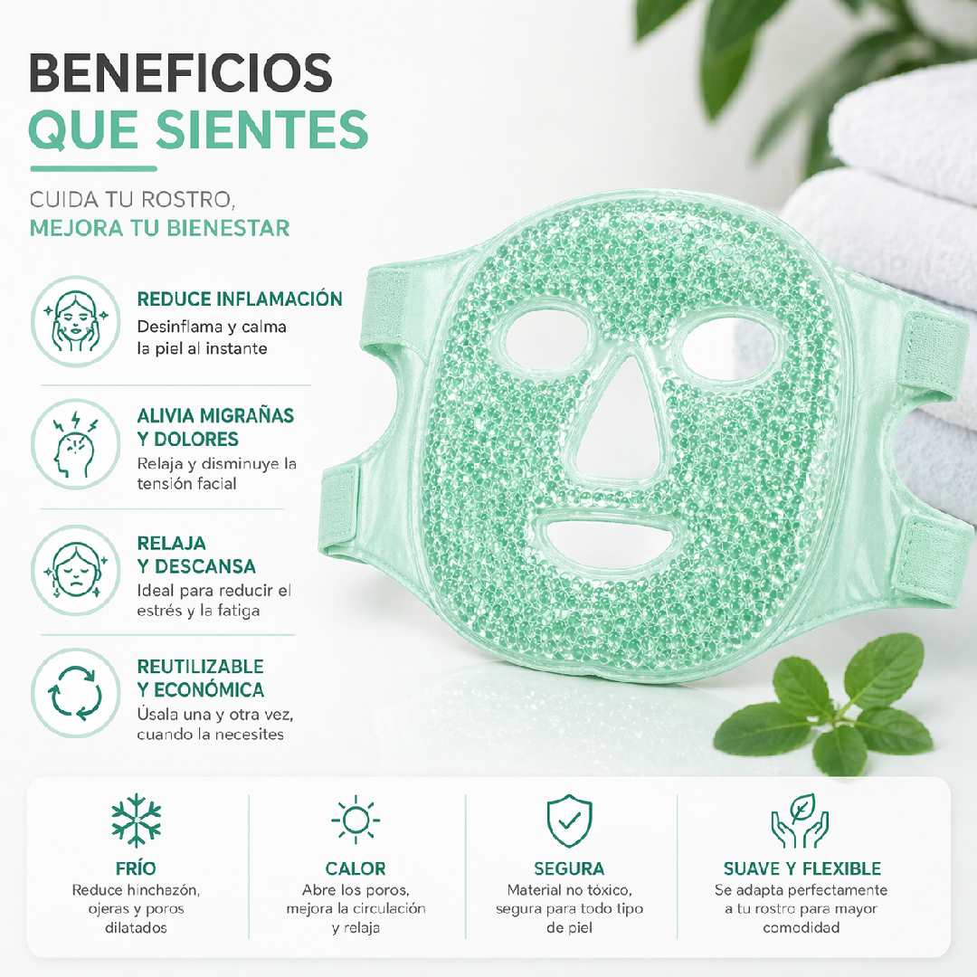 Mascarilla facial elaborada en gel flexible diseñada para brindar sensación de frío o calor según su uso. Se adapta cómodamente al rostro gracias a su diseño ergonómico con banda ajustable.